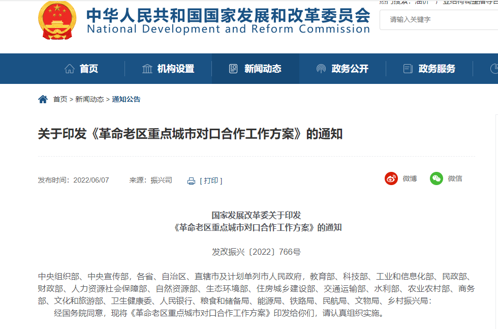 習(xí)近平總書記指出,要認真做好東西部扶貧協(xié)作和對口支援、對口合作工作,助力對口地區(qū)跨越發(fā)展。《國務(wù)院關(guān)于新時代支持革命老區(qū)振興發(fā)展的意見》(國發(fā)〔2021〕3號)明確提出,“研究建立發(fā)達省市與革命老區(qū)重點城市對口合作機制”。《“十四五”特殊類型地區(qū)振興發(fā)展規(guī)劃》進一步指出,要“持續(xù)推動對口支援、對口幫扶、對口協(xié)作、對口合作等工作,強化智力扶持,加強重點領(lǐng)域合作,激發(fā)地區(qū)發(fā)展內(nèi)生動力”。近日,經(jīng)國務(wù)院同意,國家發(fā)展改革委印發(fā)了《革命老區(qū)重點城市對口合作工作方案》(以下簡稱《工作方案》)。這是深入貫徹落實《國務(wù)院關(guān)于新時代支持革命老區(qū)振興發(fā)展的意見》和《“十四五”特殊類型地區(qū)振興發(fā)展規(guī)劃》的具體行動,也是新發(fā)展階段促進區(qū)域協(xié)調(diào)發(fā)展、支持革命老區(qū)振興發(fā)展的創(chuàng)新舉措,將有利于結(jié)對城市優(yōu)勢互補、互學(xué)互鑒、互惠互利、共謀發(fā)展,有利于加強區(qū)域協(xié)作合作,共同穩(wěn)定經(jīng)濟增長。 一、《工作方案》是新發(fā)展階段支持革命老區(qū)振興發(fā)展的創(chuàng)新舉措 黨的十八大以來,中央部委、對口支援省市、中央企業(yè)、科研機構(gòu)、社會各界等齊心協(xié)力支持革命老區(qū)振興發(fā)展,先后出臺了百余個支援革命老區(qū)建設(shè)的政策文件,幫助革命老區(qū)人民脫貧奔小康,充分發(fā)揮社會主義制度優(yōu)勢和延續(xù)我黨集中力量辦大事的優(yōu)良傳統(tǒng),推動革命老區(qū)與全國同步全面建成小康社會,邁上了全面建設(shè)社會主義現(xiàn)代化的新征程。在此背景下,編制和實施《工作方案》,有利于貫徹新發(fā)展理念,發(fā)揮中國特色社會主義制度優(yōu)勢推動共同富裕,構(gòu)建發(fā)達地區(qū)和特殊類型地區(qū)協(xié)同發(fā)展的新局面;有利于發(fā)揮偉大建黨精神的引領(lǐng)作用,激勵革命老區(qū)重點城市和發(fā)達地區(qū)部分城市共同開啟社會主義現(xiàn)代化建設(shè)新征程;有利于統(tǒng)籌區(qū)域協(xié)調(diào)發(fā)展,鞏固革命老區(qū)脫貧攻堅成果銜接推進鄉(xiāng)村振興和新型城鎮(zhèn)化,促進革命老區(qū)重點城市和發(fā)達地區(qū)共謀經(jīng)濟社會發(fā)展,同步構(gòu)建高質(zhì)量發(fā)展新格局。 《工作方案》根據(jù)國務(wù)院批復(fù)的《“十四五”特殊類型地區(qū)振興發(fā)展規(guī)劃》,明確了重點推動贛州、吉安、龍巖、三明、梅州、延安、慶陽、六安、信陽、黃岡、百色、巴中、郴州、張家界、恩施、遵義、長治、汕尾、麗水等20個城市開展對口合作,基于現(xiàn)有東西部協(xié)作、對口合作關(guān)系等,選擇位于粵港澳大灣區(qū)、長三角、京津冀的發(fā)達城市與革命老區(qū)重點城市對口合作。《工作方案》同時明確,支持其他革命老區(qū)市縣主動對接?xùn)|部、中部地區(qū)城市,比照本方案建立對口合作關(guān)系。鼓勵相關(guān)省(區(qū)、市)結(jié)合實際建立省域內(nèi)結(jié)對幫扶革命老區(qū)市縣工作機制。 二、立足革命老區(qū)振興發(fā)展定位謀劃五大對口合作重點任務(wù) 《工作方案》以習(xí)近平新時代中國特色社會主義思想為指導(dǎo),緊密圍繞《國務(wù)院關(guān)于新時代支持革命老區(qū)振興發(fā)展的意見》以及《“十四五”特殊類型地區(qū)振興發(fā)展規(guī)劃》中關(guān)于革命老區(qū)振興發(fā)展的重點任務(wù),準確把握革命老區(qū)振興發(fā)展共性,明確了優(yōu)勢互補、互惠互利、共謀發(fā)展的對口合作工作思路,聚焦促進區(qū)域協(xié)調(diào)發(fā)展、推動區(qū)域合作協(xié)作提出了5大重點任務(wù),進一步豐富了新發(fā)展階段革命老區(qū)振興發(fā)展的實踐路徑。 在促進紅色文化傳承方面,革命老區(qū)是革命傳統(tǒng)的重要承載地,黨史事件多、紅色資源多、革命先輩多,蘊含著中華民族偉大復(fù)興的強大精神力量,鑄就了井岡山精神、蘇區(qū)精神、老區(qū)精神等偉大精神,開展黨史學(xué)習(xí)教育具有獨特優(yōu)勢。《工作方案》明確,結(jié)合對口合作,積極支持赴革命老區(qū)重點城市開展學(xué)習(xí)交流,大力弘揚偉大建黨精神,傳承弘揚井岡山精神、蘇區(qū)精神、長征精神、遵義會議精神等偉大精神,鼓勵共同開展革命文物保護利用,共同搭建紅色文化旅游融合發(fā)展平臺。 在銜接推進鄉(xiāng)村振興和新型城鎮(zhèn)化方面,12個革命老區(qū)總?cè)丝诩s2.6億,約占全國的19%。《工作方案》明確,結(jié)合對口合作,做好易地扶貧搬遷后續(xù)扶持,加大就業(yè)和產(chǎn)業(yè)扶持力度,推進鄉(xiāng)村振興。持續(xù)加強消費幫扶,推進革命老區(qū)特色農(nóng)產(chǎn)品產(chǎn)銷對接。支持革命老區(qū)重點城市推進以人為核心的新型城鎮(zhèn)化,因地制宜建設(shè)區(qū)域性節(jié)點城市、重要交通樞紐、現(xiàn)代產(chǎn)業(yè)基地、商貿(mào)物流中心等。 在完善基礎(chǔ)設(shè)施和基本公共服務(wù)設(shè)施方面,革命老區(qū)大多位于京津冀、長三角、粵港澳大灣區(qū)、成渝都市圈、長江中游城市群的交通物流通道