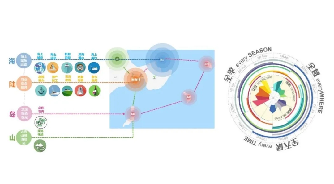設(shè)計(jì)團(tuán)隊(duì)為滿足多節(jié)點(diǎn)、多層次、多樣性的旅游和生產(chǎn)生活需求,在時(shí)間上,堅(jiān)持“全季節(jié)、全天候”的產(chǎn)業(yè)項(xiàng)目策劃,遵循當(dāng)?shù)貪O業(yè)作息規(guī)律,引導(dǎo)游客、村民進(jìn)行濱海技藝觀賞和節(jié)慶互動(dòng);在空間上,融合“山-陸-海-島”的聯(lián)動(dòng)發(fā)展模式,將海上娛樂(lè)、商業(yè)服務(wù)、自然觀光相結(jié)合,塑造山海一體的澳角村度假品牌形象。