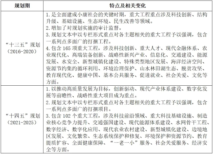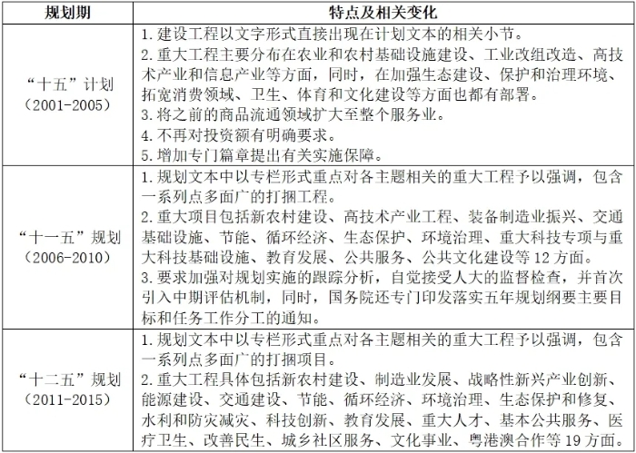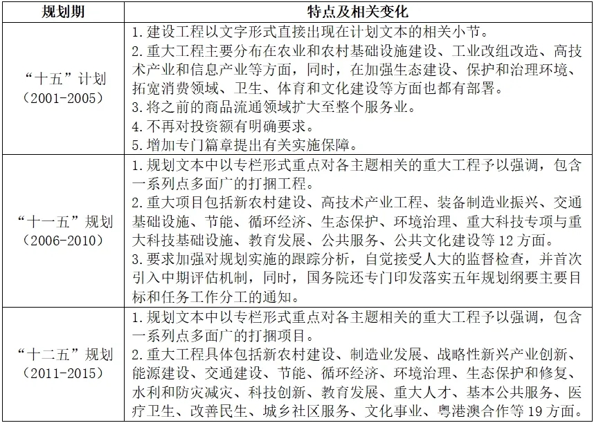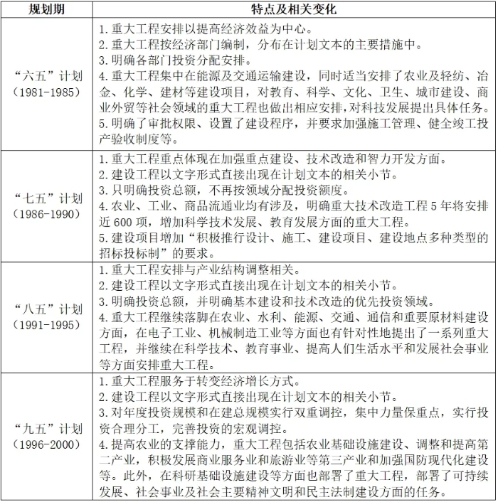 五年規劃(計劃)文本中重大工程的歷史回顧 李欣玨 曹玫 習近平總書記指出,編制和實施國民經濟和社會發展五年規劃,是我們黨治國理政的重要方式。重大工程作為五年規劃(計劃)中的核心內容,承載著實現國家戰略目標的重要使命,也是衡量和體現國家綜合實力和發展水平的重要標志。新中國成立以來,我國共編制和實施了14個五年規劃(計劃)。從“一五”計劃到“十四五”規劃,每一個五年規劃(計劃),國家都要確定百余項重大工程項目作為帶動經濟社會發展的火車頭。14個五年規劃(計劃)確定的約兩千項重大工程項目,記錄著七十余年非凡成就背后的艱辛和輝煌。以五年規劃(計劃)為引領,以重大工程項目為牽引,我國經濟社會發展取得了全方位、開創性歷史成就,發生了深層次、根本性歷史變革,為建設社會主義現代化國家奠定了堅實基礎。即將迎來的“十五五”時期是我國承上啟下的重要時期,是2035年基本實現社會主義現代化的關鍵階段,也是七大深化改革任務的完成期,更是應對復雜安全威脅的高危期,在“十五五”規劃中接續謀劃一批計長遠、促發展、利民生的重大工程項目意義重大。 作為國內規模最大的綜合性工程咨詢機構和中央政府在投資建設領域的重要咨詢單位,自1982年成立以來,中國國際工程咨詢有限公司承擔了我國幾乎所有重大工程項目的咨詢評估任務,深切感受到重大工程項目在現代化強國建設中發揮的重要作用。本文從歷史維度出發,從計劃經濟時期、計劃經濟體制向社會主義市場經濟體制轉軌時期、社會主義市場經濟體制基本建立時期、社會主義市場經濟體制完善時期等四個階段,對歷次五年規劃(計劃)文本中重大工程的特點及變化進行系統回顧。 一、計劃經濟體制時期(“一五”至“五五”) 有計劃地發展國民經濟,是新中國成立后的既定方針。為迅速恢復國民經濟并推進工業化進程,借鑒前蘇聯經驗,我國從1953年開始實施第一個五年計劃。“一五”計劃的基本任務是集中主要力量進行以前蘇聯幫助中國設計的156個建設單位為中心的、由限額以上的694個建設單位組成的工業建設,建立我國社會主義工業化的初步基礎。這一時期,重大工程項目主要集中在工業領域,項目涵蓋鋼鐵、煤炭、電力、機械、化工等多個行業。在第一屆全國人民代表大會第二次會議審議通過的《關于發展國民經濟的第一個五年計劃的報告》中,各領域重大工程以文字形式體現,一般出現在措施、要求、布局、任務等小節,包括建設或改建長春第一汽車廠、鞍山鋼鐵聯合企業、沈陽第一機床廠等生產性企業,以及建設武漢長江大橋、青藏鐵路、康藏公路等大型單體項目等。此外,還在計劃中明確了各行業領域的投資額度分配和生產性單位的產能目標,計劃性特點較為突出。此后,一大批舊中國沒有的基礎工業部門開始逐步建立,第一批國產汽車出廠、第一架國產飛機試飛、第一座原子反應堆投入運轉。第一個五年計劃的實施奠定了新中國的工業化基礎。 表1 “一五”計劃中的156個重點項目 注:作者根據《第一個五年計劃(1953—1957)》等公開資料整理。 隨后,“二五”至“五五”計劃時期,國家相關部門未正式印發計劃文本。在此期間,雖受到“大躍進”“文化大革命”等政治運動的干擾和影響,國家仍集中力量推進了一批重大工程項目,如“兩彈一星”、南京長江大橋、成昆鐵路、劉家峽水電站和大慶油田等,這些項目在科技創新、基礎設施建設等方面取得了顯著成就。“一五”到“五五”,僅用5個五年計劃的時間,我國基本形成了獨立的、比較完整的工業體系和國民經濟體系,為開展社會主義建設積累了經驗。 二、計劃經濟體制向社會主義市場經濟體制轉軌時期(“六五”至“九五”) 改革開放后,我國逐步從計劃經濟體制向社會主義市場經濟體制轉軌。這一階段的五年計劃在繼續強調經濟發展的同時,開始注重社會事業的協調發展,表明在發展戰略上,從片面追求工業特別是重工業產值產量的增長,開始轉向以提高經濟效益為中心,注重農輕重協調發展,注重經濟、科技、教育、文化、社會的全面發展。計劃名稱也從“國民經濟發展五年計劃”更名為“國民經濟和社會發展五年計劃”。重大工程項目不再局限于工業領域,相應擴展到農業、交通、能源、科技、教育等多個領域。 表2 “六五”至“九五”計劃中的重大工程特點 注:作者根據《建國以來國民經濟和社會發展五年計劃重要文件匯編》等公開資料整理。 “六五”時期國家的主要任務是繼續貫徹執行1979年黨中央提出的“調整、改革、整頓、提高”八字方針。隨著全黨全國工作重心的轉移,“六五”計劃的重大工程安排也以提高經濟效益為中心。從體現形式看,重大工程按經濟部門編制,分布在計劃文本的主要措施中;從涉及領域看,主要集中在能源和交通運輸建設領域,同時適當安排了農業及輕紡、冶金、化學、建材等建設項目,對教育、科學、文化、衛生、城市建設、商業外貿等社會領域的重大工程也做出相應安排,提出科技發展具體任務;從實施管理看,要求編制統一的固定資產投資計劃,明確審批建設等制度程序。 “七五”時期國家的主要任務是進一步為經濟體制改革創造良好的經濟環境和社會環境,“七五”計劃的重大工程體現在加強重點建設、技術改造和智力開發方面。