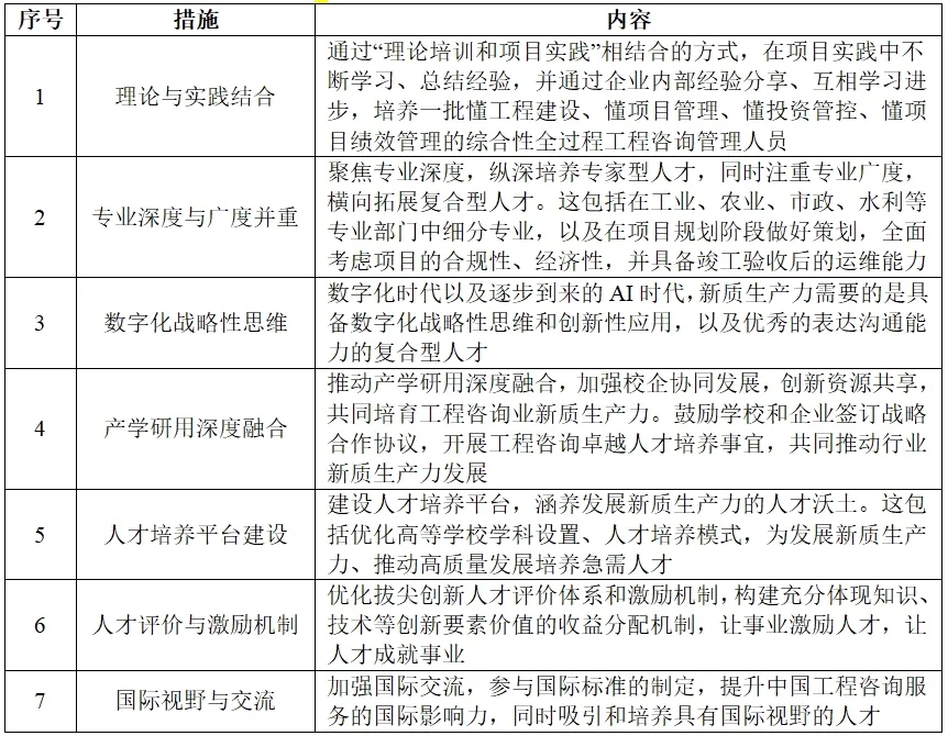 工程咨詢新質生產力培育和發展的 挑戰及建議 中咨公司2024年青馬研習第七小組 姜富華 胡曉偉 劉海若 等 編者按:高質量發展是新時代的硬道理,需要新的生產力理論來指導。2024年1月,習近平總書記在主持中共中央政治局第十一次集體學習時強調,“發展新質生產力是推動高質量發展的內在要求和重要著力點”。工程咨詢業屬生產性服務業,黨的二十屆三中全會的《決定》,作出了“聚焦重點環節分領域推進生產性服務業高質量發展”的戰略部署,為加快推動工程咨詢業高質量發展,明確了戰略方向,提供了根本遵循。新質生產力賦能工程咨詢,加快工程咨詢業高質量發展,不僅可以為現代化產業體系建設和企業發展提供更高效的智力支撐和決策參考,也有利于推動國家重大戰略、重大規劃、重大政策、重大工程落地實施,助力國家經濟發展和強國建設。 一、工程咨詢新質生產力內涵和特點 (一)工程咨詢新質生產力的內涵 以習近平同志為核心的黨中央準確把握歷史發展大勢和我國實際國情,作出了發展新質生產力的重大論斷和戰略部署,為我們在新時代新征程上進一步解放和發展生產力、推進和拓展中國式現代化提供了根本遵循和行動指南。新質生產力代表先進生產力的演進方向,是由技術革命性突破、生產要素創新性配置、產業深度轉型升級而催生的先進生產力質態。 圖1 新質生產力圖解 工程咨詢業是國民經濟的重要產業領域,在國家經濟社會發展中具有一定的戰略地位。多年來,在服務國家戰略需求、助力基礎設施建設、促進產業優化升級、推動經濟社會發展、提升國際競爭力等方面做出了重要貢獻。進一步提升工程咨詢創造智慧成果和高質量咨詢產品的能力,必須加強其自身的能力建設。新質生產力作為創新起主導作用的先進生產力,正在深刻改變生產方式和經濟增長模式。工程咨詢新質生產力本質是科技創新交叉融合突破所產生的根本性成果,其核心是通過創新引領,轉變發展理念,擺脫傳統發展路徑,探索符合新發展理念,促進工程咨詢業高質量可持續發展的新路徑。 (二)工程咨詢新質生產力特點 工程咨詢新質生產力與傳統生產力相比,其發展動力、發展形態和發展理念上有著本質的區別。新質生產力代表了最新的科技成果應用,技術更新迭代速度快,創新能力強,能夠快速適應市場變化,推出符合時代需求的高質量產品。具有高科技、高效能和高質量等特征。 1.高科技 新質生產力的形成過程實質上是科技創新成果向現實生產力轉化的過程,同時也是創造新產品、催生新產業、產生新價值的過程;新質生產力擺脫了要素驅動的數量型增長模式,知識技術密集、科技含量及其附加值高是其核心特征。工程咨詢作為知識密集型、附加值高產業,其新質生產力的培育和發展需始終強調高科技在發展中的引領地位,緊緊抓住科技創新的“牛鼻子”“衣領子”,充分發揮科技創新的增量器作用,加快關鍵核心技術和顛覆性技術有效供給,以科技創新成果助推產業發展升級,以新型生產方式促進新質生產力發展,實現工程咨詢業高質量發展。 2.高效能 全要素生產率的高效能、大幅度提升是新質生產力的核心標志;新質生產力在系列新技術突破和變革中,引領現有生產工具、生產方式、產業組織、產業形態變革調整,從而進一步激活勞動、資本、土地、科技、金融、人才、管理、信息、數據等生產要素活力,推動系列生產要素自由便捷流動、交叉組合、協作開發、融合裂變、持續優化,引起生產函數和生產關系的深刻變革,實現傳統產業升級轉型,探索生產要素投入少、資源配置效率高、環境資源成本低、經濟社會效益好的高效能發展路徑。工程咨詢新質生產力的發展意味著工程咨詢業生產效能的大幅提升、資源利用效率的大幅提高,由新技術、新產業激活已有技術與產業,促進工程咨詢業高端化和智能化。 3.高質量 高質量是社會各行業發展的核心主題,而新質生產力是社會各行業高質量發展的強大引擎,為社會各行業高質量發展提供強勁推動力和支撐力;實踐證明,過去依靠資源投入、圍繞“量的增長”為主的產業體系發展模式,已經難以為高質量發展提供新的增長動力;強調“質的提升”的新質生產力能夠實現新供給與新需求的高水平動態平衡,是一種更加注重科技創新、模式培育、場景拓展、產業協調、數字賦能、生態保護的生產力。依靠新質生產力來加快實現工程咨詢業結構調整和發展方式轉變,基于新質生產力形成新供給,提供更多高品質、高性能、更可靠、更安全、更環保的產品與服務,更好滿足有效需求,增強工程咨詢業發展的可持續性,進而形成推動高質量發展的現實解決方案。 二、工程咨詢新質生產力培育和發展面臨的挑戰 工程咨詢業是典型的知識密集型、輕資產和高附加值產業,其行業“質”的提升仍需新質生產力的助推,然而工程咨詢新質生產力的培育和發展不僅需要諸多創新科學技術、高端人才、龐大市場的支撐,更需要面臨當前以傳統模式為主的咨詢市場所帶來的挑戰。 (一)技術創新難度大及應用要求高 隨著科學技術的迅猛發展,技術更新換代的速度不斷加快,帶來了前所未有的機遇和挑戰。然而,伴隨著這種速度的加快,技術創新和研發的難度也在顯著增加。創新的門檻越來越高,不僅需要投入巨大的研究經費,還要