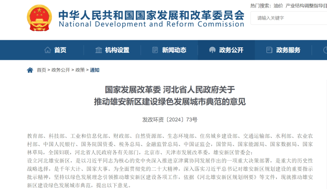 千年大計綠色為本 打造綠色發展新高地和城市建設新標桿 ——《關于推動雄安新區建設綠色發展城市典范的意見》解讀 張英健 木其堅 近日,國家發展改革委、河北省人民政府聯合印發《關于推動雄安新區建設綠色發展城市典范的意見》(發改環資〔2024〕73號,以下簡稱《意見》)。《意見》深入貫徹落實習近平總書記對雄安新區規劃建設的重要指示批示精神,堅持以綠色發展理念引領推動雄安新區建設各項工作,為雄安新區綠色高質量發展明確了方向路徑,也為全國綠色高質量發展提供了生動實踐和鮮活樣本,具有非常重要的意義。 一、綠色是建設雄安新區的鮮明底色 河北雄安新區的設立,是千年大計、國家大事。習近平總書記從謀劃選址到規劃建設,親自決策、親自部署、親自推動,傾注大量心血,為雄安新區規劃建設領航指路、把脈定向。從謀劃設立之初,習近平總書記就強調要堅持生態優先、綠色發展,劃定開發邊界和生態紅線,實現兩線合一,著力建設綠色、森林、智慧、水城一體的新區。2017年,雄安新區在規劃階段即圍繞綠色發展專門設置了綠色生態發展指標體系、清潔能源利用、資源環境承載力、大氣環境綜合治理、綠色建筑標準等10余項專題,這充分體現了雄安新區在規劃之初就厚植了“綠色基因”。2023年,習近平總書記主持召開高標準高質量推進雄安新區建設座談會并發表重要講話,強調要貫徹綠水青山就是金山銀山的理念,堅持綠色化、低碳化發展,把雄安新區建設成為綠色發展城市典范。 《意見》深入貫徹習近平總書記這一重要指示要求,提出要充分發揮雄安新區平地建新城的優勢,強化頂層設計,注重統籌協調,高標準高質量推進雄安新區城市建設與生態文明建設,積極穩妥推進碳達峰碳中和,加快形成雄安新區綠色低碳發展的空間格局、產業結構、生產方式、生活方式,持續鞏固生態環境治理成效,全面提升生態安全和綠色發展水平,建設人與自然和諧共生的綠色發展城市典范,樹立新時代美麗中國雄安樣板。應當說,《意見》繪制了一幅綠色雄安、美麗雄安畫卷。 二、分階段繪就綠色發展城市典范建設藍圖 雄安新區肩負著打造高質量發展全國樣板的歷史重任。雄安新區圍繞高水平社會主義現代化城市建設目標,堅持把綠色作為城市建設的底色,完善生態功能,拓展藍綠空間,推廣低碳模式,建設數字城市,打造新時代綠色發展新標桿。短短6年里,雄安新區從無到有、從藍圖到實景,一座高水平現代化城市正在拔地而起,堪稱奇跡。一系列設計之初的綠色設想也正在變為現實,如雄安自貿試驗區交流展示中心等充分利用建筑光伏一體化和地源熱泵技術,實現建筑電力能源的自給自足,一批高品質的綠色學校、綠色醫院、綠色辦公、綠色住宅、綠色工業建筑等示范場景在近幾年也都逐步成型。下一階段,高標準高水平建設雄安新區,也必須要牢牢把握黨中央關于雄安新區的功能定位、使命任務和原則要求,提高政治站位,保持歷史耐心,處理好近期目標和中遠期目標、城市建設速度和人口聚集規模、產業轉移和產業升級、政府和市場、承接北京非首都功能疏解和城市自身發展、城市建設和周邊鄉村振興等重大關系,確保雄安新區建設和發展的正確方向。 《意見》堅持把綠色作為高質量發展的普遍形態,堅持生態優先、綠色發展,科學提出了雄安新區建設綠色發展城市典范近、中、遠期建設目標。近期目標注重夯實雄安新區綠色發展基礎。這一時期的工作重點主要是生態空間格局的構建,到2030年“一淀、三帶、九片、多廊”的生態空間格局將初步構建,城淀共生共榮的風貌基本形成。中期目標更加注重綠色軟實力的構建。這一時期聚焦綠色產業、環境質量、生態宜居的全面提升,到2035年城市綠化、環境質量、藍綠空間都得到根本改善和顯著提升,綠色低碳現代產業格局初步確立,能效、碳排放等指標達到國內領先水平,成為綠色發展新高地和城市建設新標桿。遠期目標旨在把雄安新區全面建成高質量高水平的社會主義現代化城市。屆時雄安將成為京津冀世界級城市群的重要組成部分,各項綠色生態類指標達到國際領先水平,環境優美生態宜居成為雄安新區顯著標識,為綠色高質量發展樹立全國樣板。 三、全方位打造綠色發展城市典范 《意見》明確了建設綠色發展城市典范的重要內容、實現路徑和重點任務,樹立9個典范,打造綠色高質量發展樣板。生態空間方面,強調打造藍綠交織、清新明亮的城市生態空間,塑造綠色低碳、健康舒適的宜居生活環境,樹立宜居宜業城市典范。現代產業方面,強調構建綠色低碳產業體系,推行綠色低碳循環生產方式,樹立綠色經濟城市典范。能源方面,大力發展綠色能源,構建新型電力系統,打造低碳安全能源體系,樹立綠色能源城市典范。交通方面,健全綠色交通網絡設施,提升綠色交通管理水平,構建低碳智能交通網絡,樹立綠色交通城市典范。建筑方面,全面推進建筑綠色低碳發展,推廣綠色建造方式,強化建筑運行節能降碳管理,提升建筑領域節能降碳水平,樹立綠色建筑城市典范。環境治理方面,持續推進白洋淀生態修復,健全完善環境基礎設施,持續推進環境綜合治理,提升環境保護治理成效,樹立優美環境城市典范。綠色文化方面,強化生態文明宣傳教育,倡導綠色低碳生活方式,強化生態文明意識培