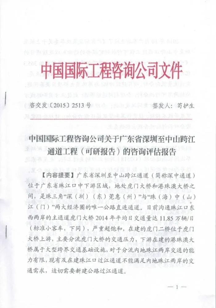 2015年11月,經(jīng)過評估組研究并進行再次評估后,中咨公司關(guān)于廣東省深圳至中山跨江通道工程(可研報告)的咨詢評估報告正式提交國家發(fā)展改革委。