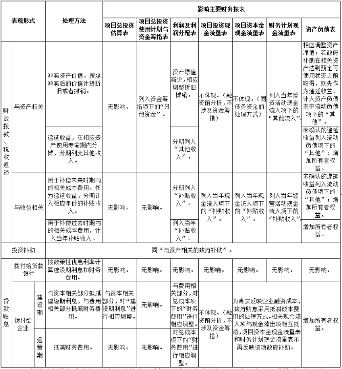 投資項目財務評價中 政府性資金的處理方法研究 張蓉 張銳 曹玫 摘要:對于部分投資項目而言,政府性資金是其建設期的重要資金來源,是運營期的生存發展保障,對降低項目運行成本、提高財務盈利水平、提升公共產品規模、質量和效率、激發社會投資活力等方面有積極作用。鑒于政府性資金在我國投資項目財務評價中的重要性和復雜性,本文以財務評價理論為基礎,既有效銜接相關會計準則,又兼顧財務評價預測性特點,提出了政府性資金在財務報表中的處理方法,旨在為投資項目財務評價提供規范性、有效性和實務性參考。 關鍵詞:投資項目;財務評價;政府性資金 一、引言 政府性資金是政府通過對國民收入的再分配,干預、調節市場經濟和社會活動的一項工具,在引導社會投資、扶持重點產業、推進結構調整、優化社會資源、增強經濟活力等方面發揮著重要作用,是推動經濟和社會高質量跨越式發展的積極力量。2019年4月,國務院公布《政府投資條例》(國務院令第712號),2014年至2021年國家發展改革委先后發布《中央預算內直接投資項目管理辦法》(2014年國家發展改革委第7號令)、《中央預算內投資補助和貼息項目管理辦法》(2016年國家發展改革委第45號令)、《國家發展改革委關于規范中央預算內投資資金安排方式及項目管理的通知》(發改投資規〔2020〕518號)、《中央預算內投資資本金注入項目管理辦法》(2021年國家發展改革委第44號令)等一系列政策文件,進一步加強和改進政府性資金及相關項目的管理工作??梢?,通過政府性資金實現宏觀調控和促進發展的目標,是我國現階段社會主義市場經濟體制的一個基本特征。 隨著我國供給側結構性改革和投融資體制改革等中國特色社會主義市場經濟實踐的逐步深化,投資項目的投融資方式、運營模式不斷創新,政府性資金呈現以下特點: 第一,使用范圍廣泛。政府性資金適用于非經營性項目和符合國家宏觀調控要求的經營性項目,涉及各行業、各類型和各主體的投資項目。根據《政府工作報告》,2015年中央預算內投資4576億元,2024年中央預算內投資安排7000億元,平均年增長率4.4%。 數據來源:2015-2024年《政府工作報告》 圖1 2015-2024年中央預算內投資規模 第二,支持方式多元。政府性資金主要包括政府資本性投入、政府購買服務支付對價和政府補助三種類型,每種類型還細分多種支持方式,同一投資項目可涉及單一或多種政府性資金支持。 第三,資金性質復雜。不同類型、不同支持方式、不同使用條件下,政府性資金的內涵、特點、使用范圍及其作用均不一樣,在投資項目財務評價中的處理方法和科目列項等也不相同。 政府性資金的上述特點給投資項目財務評價工作帶來了一定難度。雖然可以借鑒會計準則的基本原則,但由于會計與財務評價在目的作用、理論體系、工作依據、數據特征等方面均有所不同,以致財務評價實踐中缺乏對政府性資金的處理細則,出現了“理解認識不同” “分類界定不同”“處理方法不同”等一系列問題,影響了投資項目決策的準確度和可靠度。本文從實踐出發,在系統梳理政府性資金的分類、內涵、特點、適用范圍以及對財務評價影響的基礎上,研究提出各類政府性資金在財務評價中的處理方法,以期能進一步提高投資項目決策的科學性和可靠性,充分發揮各類政府性資金的作用。 二、政府性資金的概述 (一) 政府性資金的概念 廣義的政府性資金是指政府運用公權力征集、管理、使用的所有資金[1]。本文中的政府性資金是指以投資項目為載體,政府根據項目性質、建設主體、運營模式等,采用不同投入方式在項目全生命周期內給予的資金支持,以發揮政府性資金在實現宏觀調控、促進經濟社會全面協調可持續發展中的作用。非貨幣性資產投入不在本文中進行討論。 實務工作中,易混淆政府性資金和政府投資資金的概念。根據《政府投資條例》,政府投資資金應當投向市場不能有效配置資源的社會公益服務、公共基礎設施、農業農村、生態環境保護、重大科技進步、社會管理、國家安全等公共領域的項目,安排方式包括直接投資、資本金注入、投資補助、貸款貼息等。其中,采用直接投資和資本金注入方式的政府投資資金屬于政府資本性投入;貸款貼息屬于政府補助。投資補助在財務評價中的處理方式主要有兩種。一是屬于政府資本性投入,對于我國境內設立的國有及國有控股企業,投資補助增加資本公積或者實收資本。二是屬于與資產相關的政府補助,對于我國境內設立的企業,投資補助沖減資產賬面價值或確認為遞延收益。本文綜合考慮適用范圍等因素,投資補助作為政府補助處理。 (二)政府性資金的分類和特點 按照政府宏觀調控需要以及投資項目的項目性質、運營模式和盈利能力,政府性資金主要包括政府資本性投入、政府購買服務支付對價和政府補助等類型。 1.政府資本性投入 政府資本性投入是政府以投資者身份投入的資本,屬于所有者權益,其中政府履行出資人職責、享有出資人權益,具備有償性和享有投資者權益回報的特點,包括政府直接投資、資本金注入兩種政府投資方式。 直接投資,是指政府安排政府投資資金投入非經營性項目,并由政府有關機構或其指定、委托的機關、團體、事業單位等作為項目法人單位組織建設實施的方式。 資本金注入,